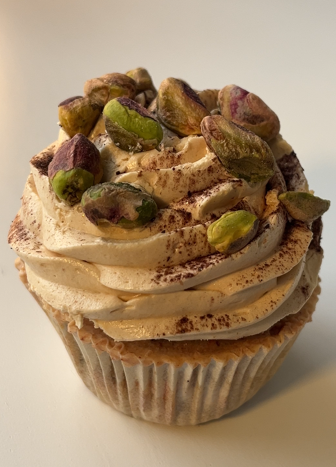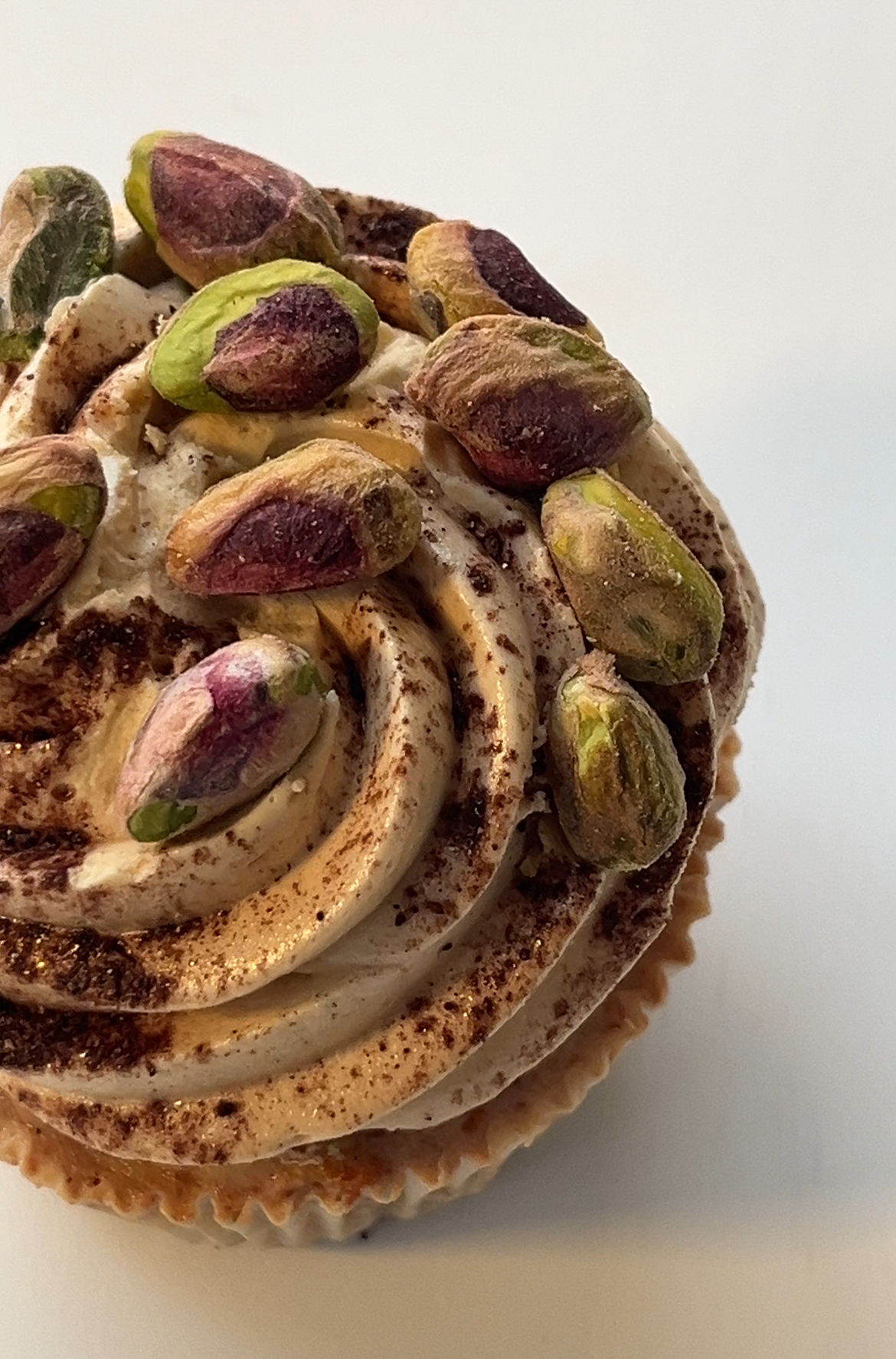 Make sure your cupcakes are completely cool before topping them with frosting. You can use an offset spatula or a spoon to make big swirly, frosted cupcakes or a pastry bag fit with a star tip (I use 2D) for something a little more gourmet. Whatever you choose, top it off with some pistachios!